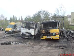 O godzinie 3.30 pracownik parkingu strzeżonego w Słupsku przy ulicy Koszalińskiej zauważył dym wydobywający się spod maski ciężarowego Mercedesa. Widząc to natychmiast wezwał Straż Pożarną oraz Policję. W chwilę po tym auto stanęło w płomieniach. Ogień błyskawicznie trawił Mercedesa i rozprzestrzeniał się na inne zaparkowane samochody. Akcja gaśnicza strażaków rozpoczęła się w kilka minut po telefonicznym zgłoszeniu jednak pomimo tego kompletnemu spaleniu uległy dwie ciężarówki. Dwie inne sąsiadujące z tymi autami zostały znacznie uszkodzone. Podczas prowadzonej akcji gaśniczej miały też miejsce liczne wybuchy pękających od ciśnienia opon i to z pewnością obudziło zaspaną dzielnicę Słupska.