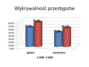 Dane statystyczne wyraźnie pokazują, że dynamika przestępstw znacznie spada, a ich wykrywalność nadal rośnie. Odnotowano prawie 16% mniej kradzieży, 19% mniej bójek i pobić, a także o ponad 8% mniej jednych z najpoważniejszych przestępstw, jakimi są rozboje. Dzięki profesjonalnym działaniom policjantów całego województwa wykrywalność wszystkich przestępstw wzrosła z 60% do 76%.