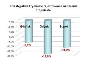 Rośnie także bezpieczeństwo w największych miastach regionu. Wszędzie tam odnotowano spadki dynamiki przestępstw kryminalnych rzędu od ponad 9 do 14%.