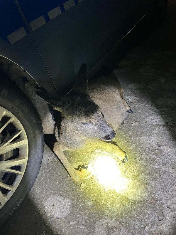 Policjanci z Referatu Patrolowo – Interwencyjnego Komendy Powiatowej Policji w Wejherowie, dziś przed 1:00 w nocy, wracając z miejsca zabezpieczenia pożaru domku letniskowego, w rejonie leśnym przy miejscowości Zbychowo, zauważyli na jezdni leżącego młodego koziołka sarny. Kiedy podjechali bliżej i zatrzymali radiowóz, koziołek wstał i zrobił kilka kroków w ich kierunku i następnie położył się przy radiowozie. Funkcjonariusze zauważyli, że zwierzę było ranne, krwawiło z ucha i nosa, gdyż prawdopodobnie wcześniej doszło do jakiejś kolizji. Zaopiekowali się nim i szybko wezwali na miejsce lekarza weterynarii. Lekarz zbadał zwierzę. Okazało się, że nie ma żadnych złamań czy innych poważnych obrażeń, a jedynie drobne skaleczenia. Zdecydowano więc, że zwierzę zostanie odstawione w bezpieczne miejsce do lasu, gdzie zapewne szybko wróci do swojej sarniej mamy.