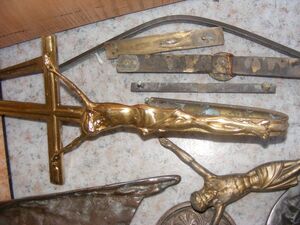 7 kwietnia br. w nocy policjanci patrolujący teren cmentarza łostowickiego zatrzymali na gorącym uczynku 41-latka, który w ciemnościach kradł mosiężne i miedziane elementy. Dwa dni później w ręce kryminalnych z Oruni wpadł właściciel skupu złomu, który przyjmował skradzione przedmioty. Funkcjonariusze zabezpieczyli 50 kg literek, cyfr, krzyży i wizerunków świętych. Prosimy o kontakt z komisariatem na Oruni osoby, które na zamieszczonych zdjęciach rozpoznają swoje mienie.
