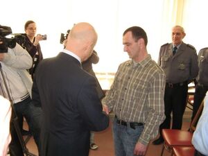 Wczoraj o godzinie 13:00 w Komendzie Powiatowej Policji w Wejherowie Komendant Powiatowy Policji mł. insp. Krzysztof Lawer wraz z Starostą Wejherowskim Józefem Reszke z Prezesem Stowarzyszenia Bezpieczny Powiat Wejherowo Bogusławem Guziuk wręczyli upominki za bohaterską postawę Panu Witoldowi Draws.