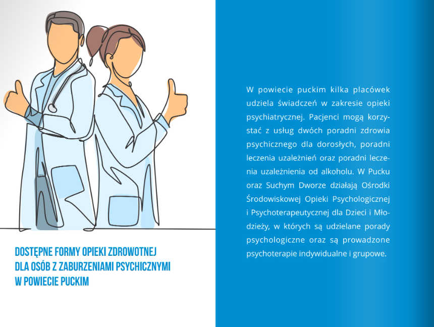Powiat Pucki wydał już broszurę, która zawiera informacje o dostępnej pomocy dla osób z zaburzeniami psychicznymi na terenie powiatu. W przewodniku znajdują się dane kontaktowe, opis usług z zakresu opieki zdrowotnej, pomocy społecznej oraz aktywizacji zawodowej.