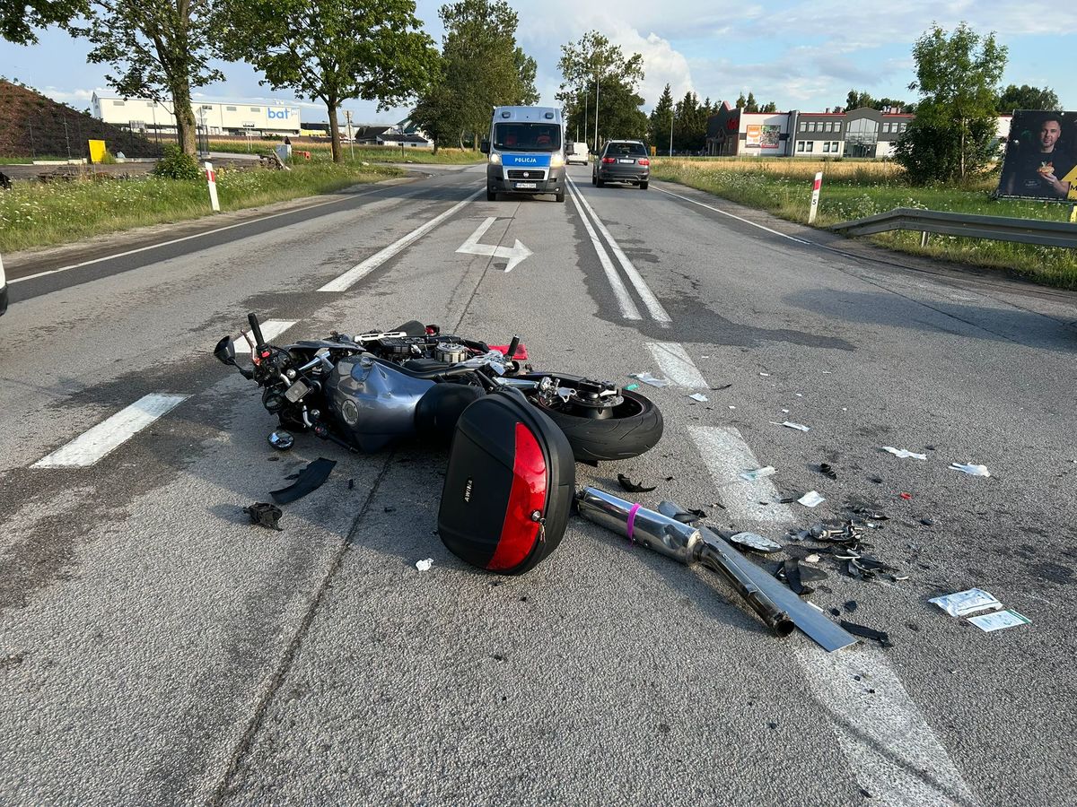 Wczoraj policjanci z kartuskiej drogówki pracowali na miejscu wypadku drogowego z udziałem motocyklisty i auta osobowego. Według wstępnych ustaleń kierowca peugeota nie ustąpił pierwszeństwa motocykliście. Kierujący jednośladem został ranny. Za spowodowanie wypadku drogowego grozi do 3 lat pozbawienia wolności.