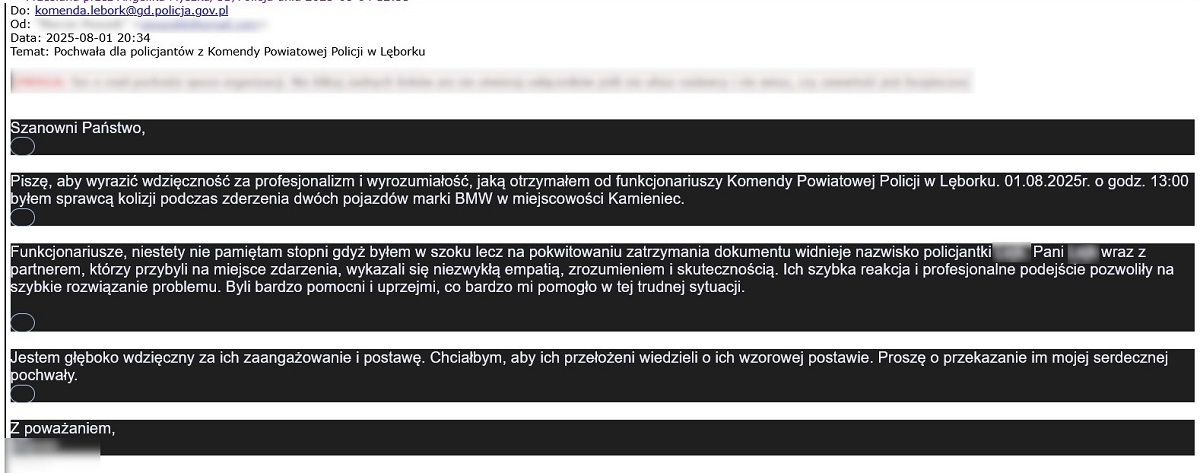 „Szanowni Państwo, piszę aby wyrazić wdzięczność za profesjonalizm i wyrozumiałość, jaką otrzymałem od funkcjonariuszy Komendy Powiatowej Policji w Lęborku. 01.08.2025 r. o godz. 13:00 byłem sprawcą kolizji podczas zderzenia dwóch pojazdów marki BMW w miejscowości Kamieniec.