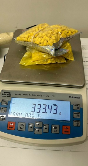 Przypuszczenia policjantów co do tego, że mężczyzna posiada przy sobie zabronione substancje, okazały się słuszne. Policjanci ujawnili przy podejrzanym MDMA w postaci różowej tabletki a w mieszkaniu, w którym mieszkał z matką, blisko 370 gramów marihuany i 325 gramów amfetaminy. Część z nich była w worku schowanym w zamrażalniku, inne w dużym pudełku po serku wiejskim.