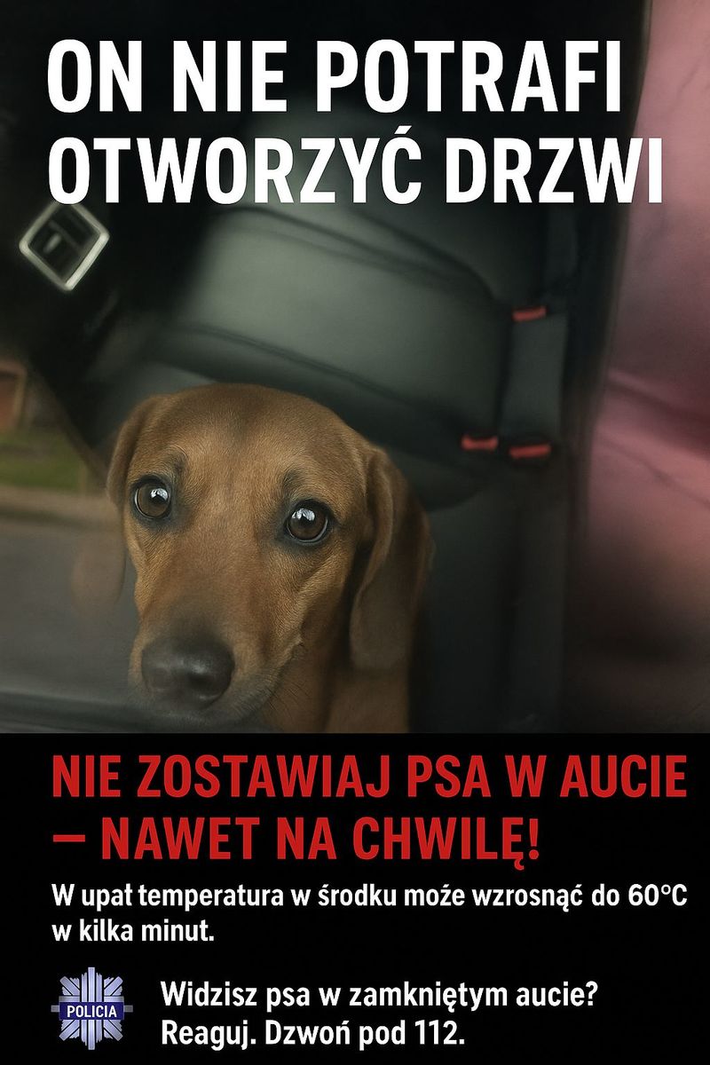 Okres letni, to czas upałów. Pamiętaj, że niebezpieczne dla zdrowia jest przebywanie w rozgrzanym samochodzie, a pozostawienie w nim dzieci oraz zwierząt prowadzi do pewnej tragedii. Policjanci apelują o rozsądek i rozwagę.