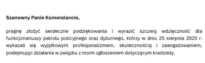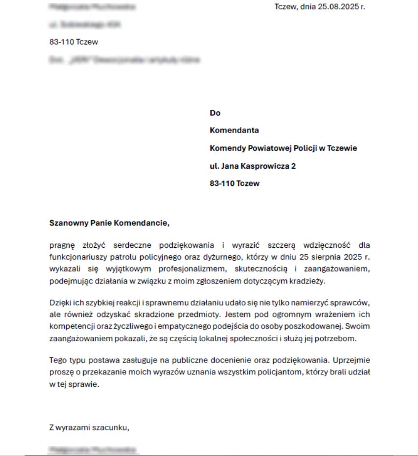 We wtorek, dzień po interwencji, do Komendy Powiatowej Policji w Tczewie wpłynęły podziękowania od 43-latki. Kobieta w swoim piśmie wyraziła wdzięczność za szybką reakcję dyżurnego oraz działania policjantów prewencji. Podkreśliła ich profesjonalizm i zaangażowanie.