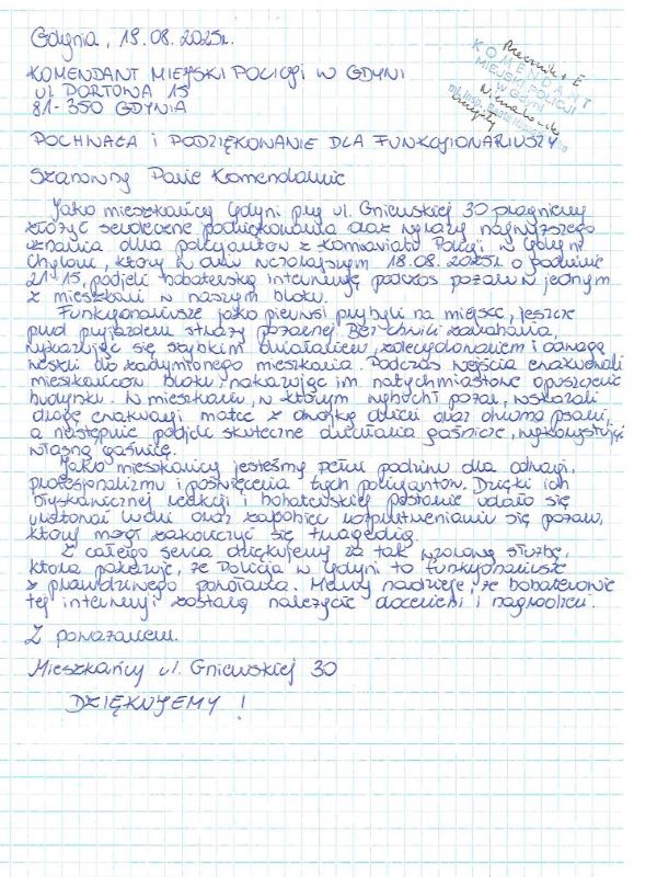 Mieszkańcy bloku przy ulicy Gniewskiej, w piśmie wyrazili ogromną wdzięczność i szacunek dla funkcjonariuszy, którzy nie zawahali się wejść w sam środek zagrożenia, aby ratować ludzkie życie i mienie.