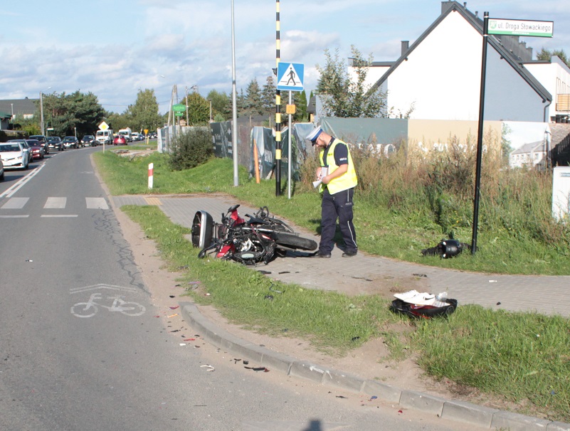 Wczoraj 17 września policjanci z pruszczańskiej drogówki pracowali na miejscu wypadku drogowego z udziałem motocyklisty i auta osobowego. Według wstępnych ustaleń kierowca skody nie ustąpił pierwszeństwa motocykliście. Kierujący jednośladem został ranny. Za spowodowanie wypadku drogowego grozi do 3 lat pozbawienia wolności.