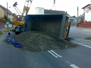 Dziś około godziny 05.00 dyżurny jednostki w Sztumie otrzymał zgłoszenie, że na skrzyżowaniu ulic Zawadzkiego i Traugutta na łuku drogi wywróciła się naczepa samochodu ciężarowego. Jak ustalili policjanci kierującemu ciężarówką podczas wjazdu pod wzniesienie na skrzyżowaniu ulic Zawadzkiego i Traugutta najprawdopodobniej uszkodził się silnik. W wyniku tego pojazd zaczął się staczać w dół, a jedna z naczep uległa wywróceniu. Ponad sześć ton rzepaku wysypało się na drogę i utrudniło ruch na ponad 6 godzin. W trakcie interwencji mundurowi ujawnili, że kierujący nie posiada aktualnej opłaty OC.
