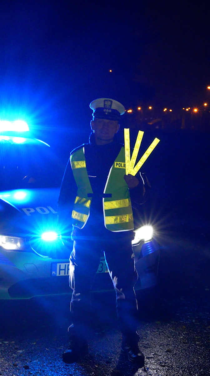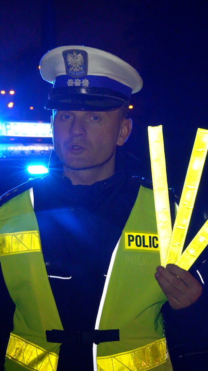 Noc. Policjant ubrany na ciemno stoi na poboczu. Patrzy w kamerę i pyta: