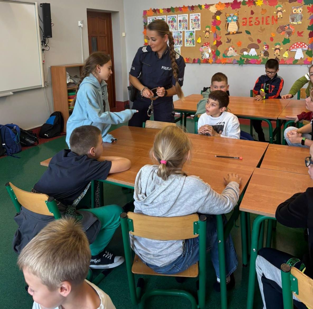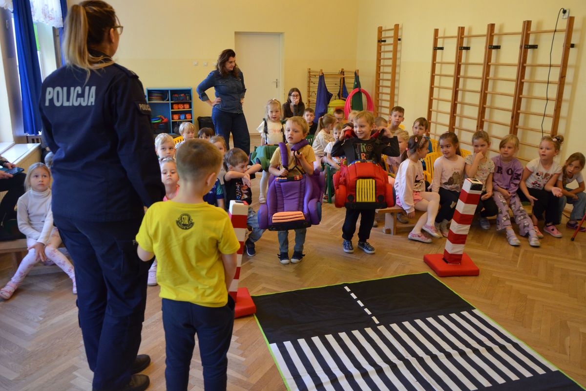 Policjanci rozmawiali z dziećmi o zasadach bezpiecznego poruszania się po drodze i o noszeniu odblasków.