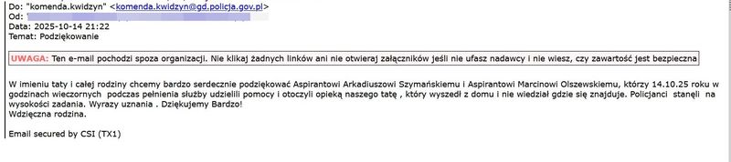 Policjanci przypominają, aby szczególnie w okresie chłodniejszych dni zwracać uwagę na osoby starsze, zagubione lub nieadekwatnie ubrane do pogody. Nie bądźmy obojętni — reagujmy! Wystarczy jeden telefon na numer 112, by zapobiec nieszczęściu i – tak jak w tym przypadku – uratować czyjeś życie.