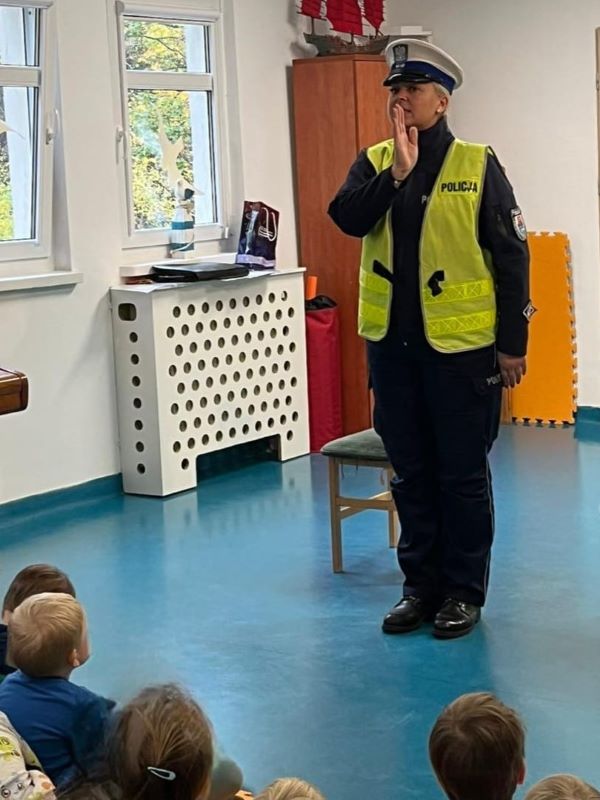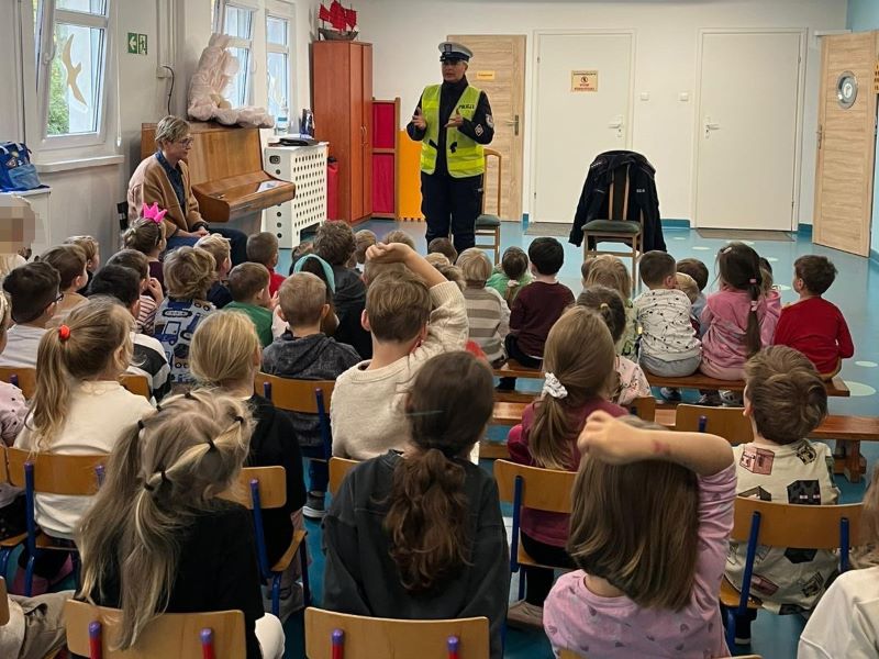 Policjantka z drogówki opowiadała najmłodszym o zasadach bezpiecznego poruszania się po drogach oraz o tym, jak ważne jest, żeby być widocznym dla kierowców, szczególnie jesienią i zimą, gdy szybciej zapada zmrok, a widoczność bywa ograniczona. Funkcjonariuszka tłumaczyła, że odblaski to nie tylko modny dodatek, ale przede wszystkim element, który może uratować życie. Zachęcała dzieci, aby nosiły je zarówno na plecakach, jak i kurtkach.