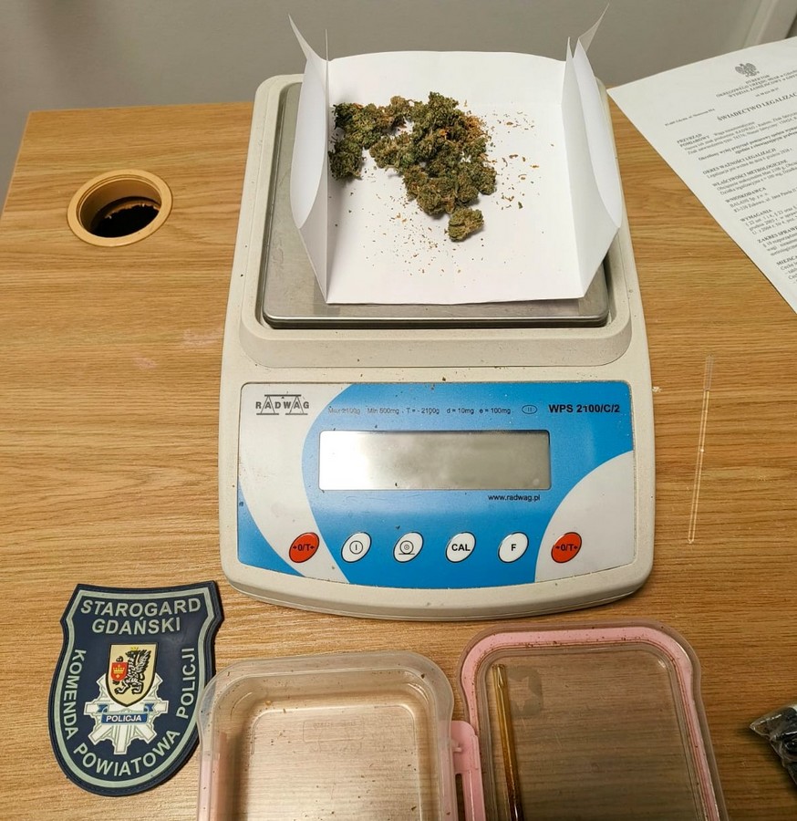 W środę przed godziną 2:00 do dyżurnego starogardzkiej komendy wpłynęły dwa zgłoszenia z prośbą o interwencję pod tym samym adresem. Jedno dotyczyło wtargnięcia dwóch agresywnych mężczyzn na teren prywatnej posesji, a drugie braku możliwości odebrania swoich rzeczy. Na miejsce natychmiast udali się policjanci z referatu patrolowo-interwencyjnego. Podczas czynności funkcjonariusze ustalili, że jednym z uczestników interwencji jest 29-letni mężczyzna, który wcześniej dzwonił na numer alarmowy, prosząc o przyjazd patrolu. Jak się okazało, mieszkaniec Kociewia posiadał przy sobie susz roślinny. Badanie policyjnym testerem wykazało, że była to marihuana. Mężczyzna został zatrzymany, a policjanci przeszukali jego pokój, w którym znaleźli 2 szklane słoiki z marihuaną, woreczek strunowy z siarczanem amfetaminy, wagę elektroniczną oraz młynek do mielenia marihuany. Z zabezpieczonych przez policję środków można byłoby przygotować ponad 150 pojedynczych porcji. Podejrzany usłyszał już zarzuty dotyczące posiadania znacznej ilości narkotyków, za co grozi mu do 10 lat więzienia. Po przesłuchaniu prokurator zastosował wobec niego dozór policyjny.