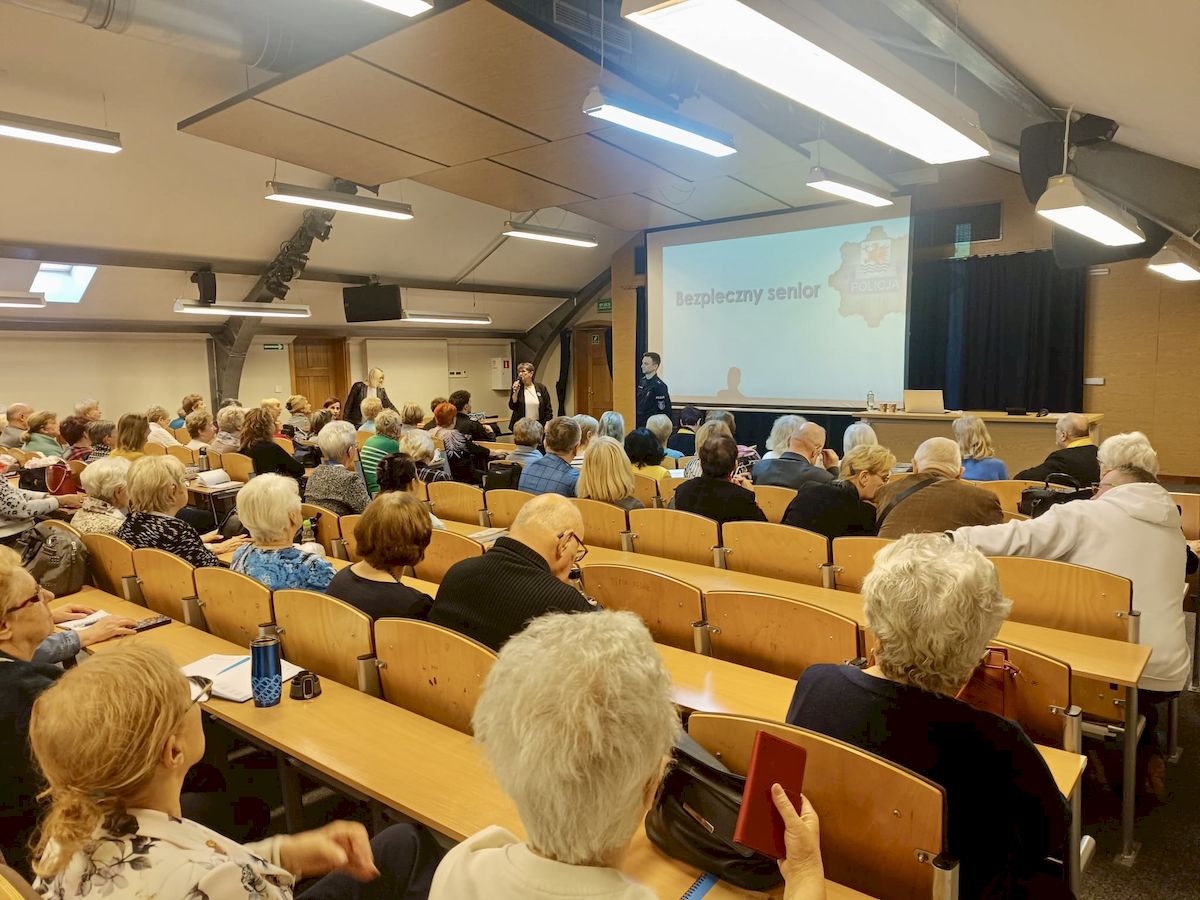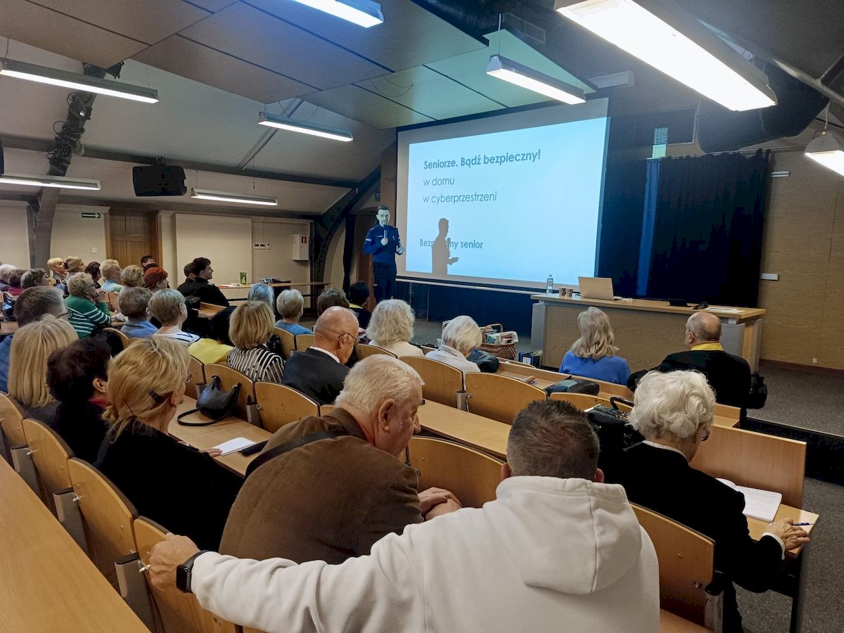 Wczoraj odbyło się kolejne spotkanie w ramach działań profilaktycznych prowadzonych przez słupskich policjantów na rzecz bezpieczeństwa seniorów. Funkcjonariusze połączyli siły z uczniami klasy czwartej Policyjnego Liceum Ogólnokształcącego w Słupsku i wspólnie wskazywali seniorom zagrożenia, z którymi mogą spotkać się w cyberprzestrzeni. W spotkaniu zorganizowanym przez Słupski Uniwersytet Trzeciego Wieku udział wzięło blisko 100 osób.