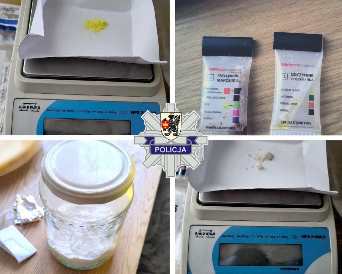 Policjanci z Referatu Patrolowo-Interwencyjnego Komendy Powiatowej Policji w Starogardzie Gdańskim pojechali sprawdzić miejsce zamieszkania 46-latka, wobec którego sąd wydał nakaz doprowadzenia do aresztu. Mężczyzna miał do odbycia karę zastępczą 48 dni pozbawienia wolności za wcześniejszą kradzież z włamaniem. Gdy funkcjonariusze wielokrotnie pukali do drzwi, nikt ich nie otwierał. W pewnym momencie, w jednym z okien policjanci zauważyli mężczyznę, który wyglądem odpowiadał wizerunkowi osoby poszukiwanej. Mimo dalszego pukania do drzwi nie było żadnej reakcji ze strony osoby, która znajdowała się w budynku. Wówczas policjanci zauważyli, że okno do piwnicy jest otwarte i za jego pomocą dostali się do piwnicy, a następnie na piętro budynku. Tam zatrzymali poszukiwanego przez sąd 46-latka. Zgodnie z postanowieniem sądu, mężczyzna mógł uwolnić się od odsiadki, wpłacając grzywnę w wysokości 960 zł, jednak nie dysponował takimi środkami. Podczas interwencji mundurowi zauważyli na jednym z parapetów dwa zawiniątka. Jedno z żółtym proszkiem, a drugie z białą zbryloną substancją. Poza tym podobny biały proszek policjanci znaleźli wewnątrz słoika znalezionego w kuchennej szafce. Badanie testerem wykazało, że była to amfetamina i mefedron. Mężczyzna został zatrzymany i jeszcze tego samego dnia trafił do aresztu śledczego.