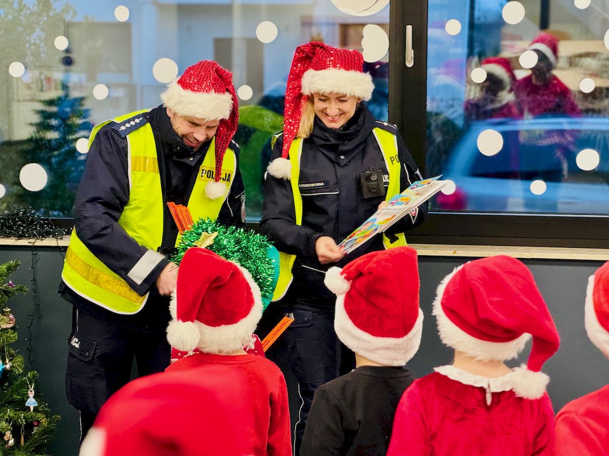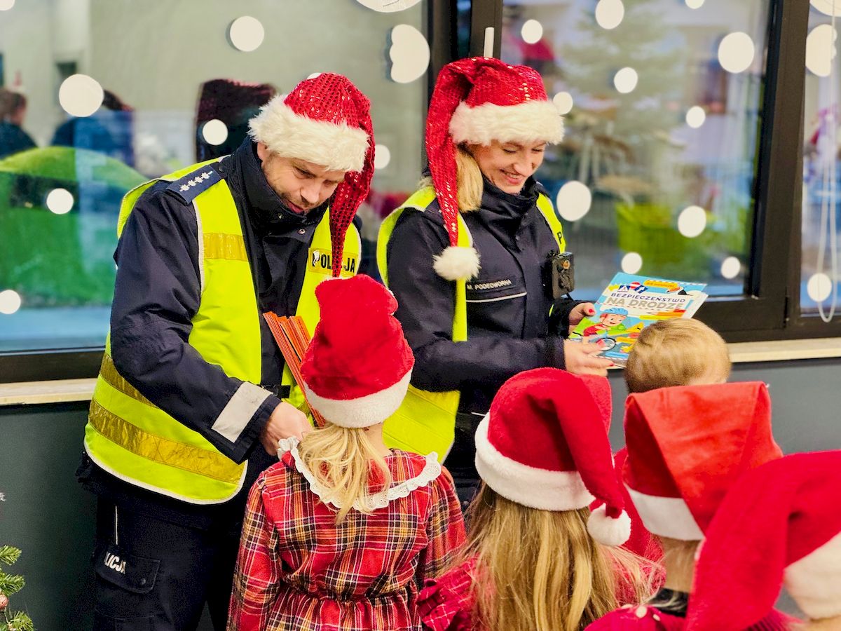 Po zakończeniu działań na drodze policjanci odwiedzili przedszkole, gdzie czekała na nich grupa zaciekawionych dzieci obserwujących, co dzieje się przed placówką. Funkcjonariusze wytłumaczyli, jak ważne jest noszenie elementów odblaskowych oraz jak prawidłowo zachowywać się w rejonie jezdni. W ramach mikołajkowej niespodzianki najmłodsi otrzymali książeczki profilaktyczne oraz odblaski, dzięki którym będą lepiej widoczni po zmroku. Działania te zostały zorganizowane w związku z jutrzejszymi mikołajkami i miały na celu podkreślić, że bezpieczeństwo dzieci i wszystkich uczestników ruchu drogowego jest dla policjantów najważniejsze.