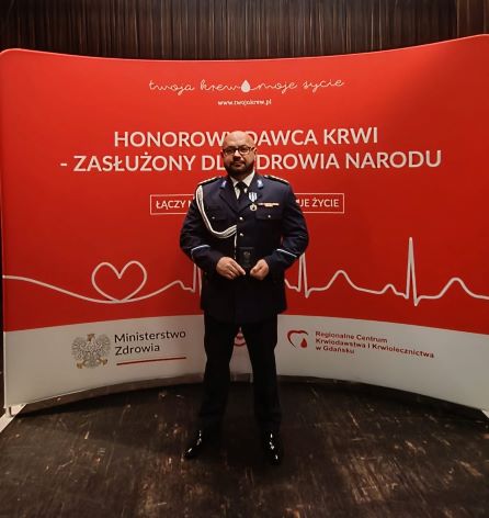 W gronie wyróżnionych znalazł się także asp. sztab. Michał Radomski z Komendy Powiatowej Policji w Kartuzach, który na swoim koncie ma już ponad 24 litrów krwi oddanej dla potrzebujących. Z dumą wskazuje, że oddawanie krwi traktuje jako przedłużenie swojej służby na rzecz innych. Jedna jednostka krwi może uratować życie nawet trzem osobom i co minutę ktoś tej krwi potrzebuje.