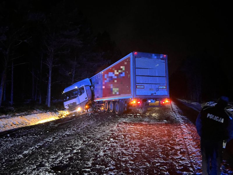 Dzisiejszej nocy, 2 stycznia 2026 r. około godziny 1:30, policjanci ruchu drogowego otrzymali zgłoszenie o zdarzeniu drogowym na drodze krajowej nr 25, na odcinku Rzeczenica - Sporysz, gdzie pojazd ciężarowy wypadł z drogi i zablokował przejazd.