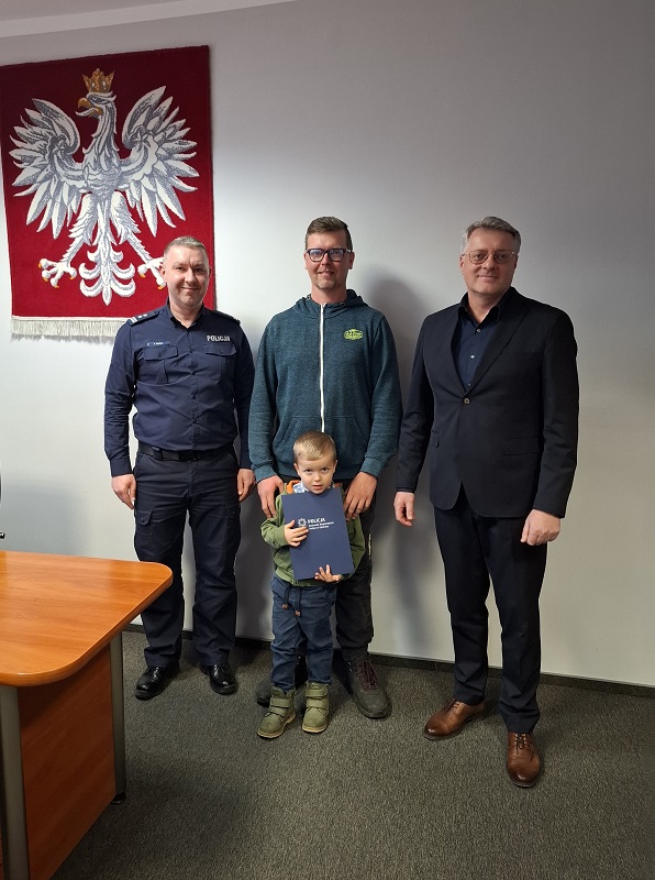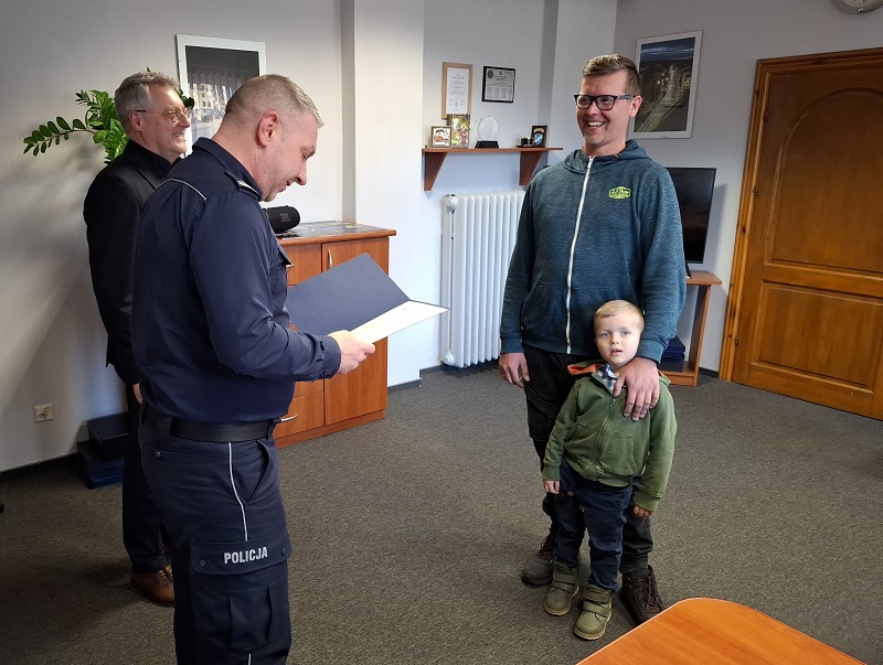W piątek 6 marca Komendant Powiatowy Policji w Lęborku mł. insp. Arkadiusz Guzek oraz jego zastępca mł. insp. Grzegorz Jarosiewicz podziękowali Panu Pawłowi za jego niezwykłą odwagę i zaangażowanie w niesieniu bezinteresownej pomocy drugiemu człowiekowi.