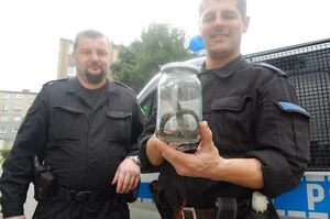 W poniedziałek do lęborskiej komendy zadzwoniła kobietą informując, że na terenie jednego z przedszkoli znajduje się wąż. Policjanci natychmiast przybyli na miejsce i w wyniku przeszukania odnaleźli stworzenie terroryzujące przedszkolaków. Wąż na widok funkcjonariuszy zaczął uciekać. Po krótkim pościgu gada zatrzymano i osadzono w słoiku. Jak się okazało zatrzymanym okazał się Zaskroniec Zwyczajny, którego policjanci wypuścili wolno w lesie.