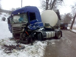 Wczoraj około godz. 09.00 w Dzierzgoniu na ul. Zawadzkiego na drodze wojewódzkiej nr 515 doszło do zdarzenia drogowego. Droga zablokowana była ponad 3 godziny. Przybyli na miejsce kolizji policjanci ustalili, iż najprawdopodobniej kierujący pojazdem man nie dostosował prędkości do warunków panujących na drodze. Podczas nagłego hamowania ciągnięta przez niego przyczepa wpadła w poślizg i uderzyła w jadącą z przeciwnego kierunku scanię. Zderzenie było tak silne, że znacznemu uszkodzeniu uległ pojazd scania. Interweniujący strażacy zmuszeni byli również do usunięcia uszkodzonego drzewa, które zagrażało bezpieczeństwu mieszkańcom Dzierzgonia.