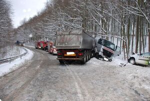 W piątek o godz. 8.46 w Kolbudach 31-letni kwidzynianin kierujący ciężarowym mercedesem z naczepą na zaśnieżonym łuku drogi stracił panowanie nad pojazdem. Naczepa zjechała na pas ruchu przeciwnego, którym jechał opel corsa. 33-letni gdynianin kierujący oplem zjechał na lewy pas i zderzył się czołowo z ciągnikiem samochodowym mercedesa. Kierowcy obu pojazdów byli trzeźwi. Do szpitala trafił kierowca opla corsy.