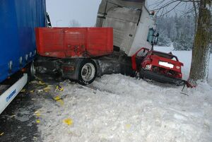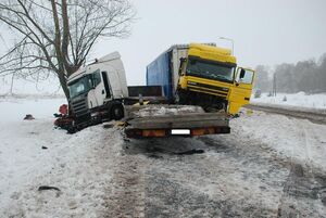 Wczoraj po godz. 7.00 dyżurny policji przyjął zgłoszenie o zdarzeniu drogowym na drodze krajowej nr 22 w Cierzniach w gminie Debrzno. Policjanci zabezpieczyli miejsce zdarzenia. Funkcjonariusze ustalili, że kierujący samochodem ciężarowym daf jechał z pustą naczepą. Jak wstępnie ustalili policjanci, na prostym odcinku drogi naczepę zarzuciło na przeciwległy pas ruchu i uderzyła w jadącego z przeciwka opla vectrę. Zepchnęła go na pobocze i przycisnęła do drzewa. Następnie naczepa uderzyła również w jadącą za oplem ciężarową scanię. W wyniku zdarzenia kierowca opla i kierowca jednego z tirów doznali obrażeń ciała. Zostali przewiezieni do człuchowskiego szpitala.