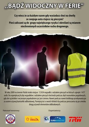 Kierowca już w momencie opuszczenia auta chodź na chwilę staje się pieszym, a jak wiadomo piesi należą do grupy największego ryzyka i określani są mianem niechronionych uczestników ruchu drogowego. Do największej liczby wypadków z udziałem pieszych dochodzi podczas złych warunków pogodowych, gdy dni są krótkie i wczesnym popołudniem jest już ciemno. Dlatego podczas akcji oprócz rozdawania kamizelek odblaskowych dla kierowców jak i elementów odblaskowych dla najmłodszych będziemy starali się wpłynąć na kierowców by korzystali z odblasków podczas przebywania poza pojazdem, jak i by sami nakłaniali własne pociechy" do używania odblasków podczas poruszania się po drodze.