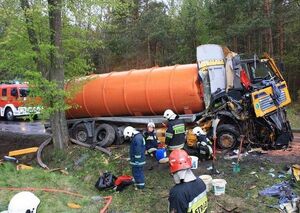 W poniedziałek kilka minut przed 18:00, dyżurny lęborskiej komendy otrzymał zgłoszenie o wypadku drogowym przed Łebą w którym miała uczestniczyć cysterna. Na miejscu okazało się, że był to beczkowóz do przewodu odpadów. Policjanci ustalili, że kierowca samochodu ciężarowego Man jadąc od strony Lęborka do Łeby uderzył w drzewo. Teraz funkcjonariusze będą wyjaśniać jak do tego doszło. Kierowca - 33 letni mężczyzna, miał w organizmie ponad promil alkoholu. Z pijanym kierowcą jechał pasażer, który na skutek wypadku doznał złamań rąk i nogi. Na miejscu policjanci zabezpieczyli ślady i wykonali oględziny z udziałem biegłego.