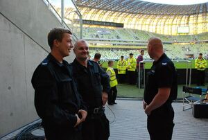 Rano, w dzień meczu, na stadion pojechała oficjalna delegacja z Komendantem Głównym Policji gen. insp. Andrzejem Matejukiem i wiceministrem Adamem Rapackim na czele, by ocenić ostatnie przygotowania do tak wielkiej imprezy sportowej. Policyjne zabezpieczenie obserwowali także funkcjonariusze z innych komend wojewódzkich. Spotkanie policjantów z miast, gdzie również odbędą się mecze podczas Euro2012 było okazją do obserwacji zachowań kibiców i wspólnej wymiany doświadczeń.