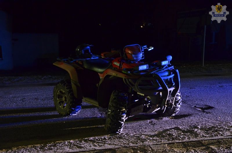 W minioną sobotę przed północą dyżurny kartuskiej komendy otrzymał zgłoszenie o wypadku, do którego doszło na trasie Lębork - Sierakowice w miejscowości Poręby. Jak ustalili przybyli na miejsce wypadku policjanci, kierujący quadem 28-latek jadąc w kierunku Sierakowic na łuku drogi stracił panowanie nad pojazdem i zjechał na pobocze gdzie się przewrócił. Podczas sprawdzenia stanu trzeźwości kierującego okazało się, że jest on nietrzeźwy, mężczyzna miał w organizmie ponad promil alkoholu.
