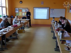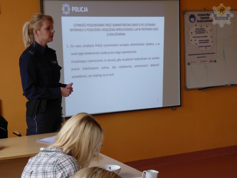 Policjantka z lęborskiej komendy przeprowadziła szkolenie dyrekcji i grona pedagogicznego Szkoły Podstawowej w Łebuni w zakresie zasad postępowania w przypadku ujawnienia na terenie szkoły ładunku wybuchowego. Oprócz tego funkcjonariuszka przedstawiła zasady i cel funkcjonowania Krajowej Mapy Zagrożeń Bezpieczeństwa.