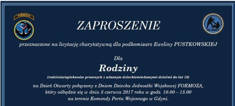 W ramach licytacji prowadzonych w celu zebrania funduszy na leczenie podkom. Eweliny Pustkowskiej z KWP w Gdańsku - Jednostka Wojskowa FORMOZA przygotowała specjalne zaproszenie na Dzień Otwarty połączony z Dniem Dziecka Jednostki Wojskowej FORMOZA. Zapraszamy do licytacji!