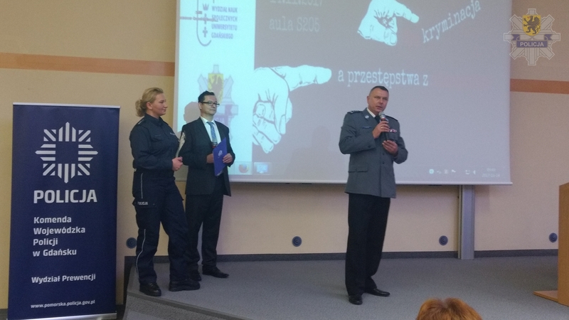 Policjanci z Wydziału Prewencji Komendy Wojewódzkiej Policji w Gdańsku przy współpracy z pracownikami naukowymi Instytutu Psychologii Uniwersytetu Gdańskiego zrealizowali trzecią z cyklu konferencję pt. ”Wyzwania współczesnej profilaktyki zagrożeń społecznych. Stygmatyzacja, dyskryminacja a przestępstwa z nienawiści”.