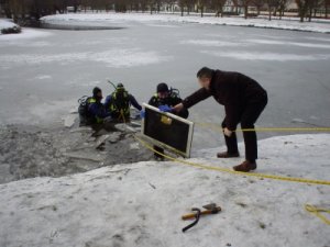 18.02.05 - policjanci z CBŚ ustalili, że zatrzymani przez nich sprawcy napadu na Tesco mogli dokonać podobnych napadów w kraju. Dziś wyłowili ze stawu na Jelitkowie dowód rzeczowy do prowadzonego śledztwa. Jest to telewizor plazmowy skradziony w czasie napadu.