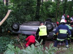 Policjanci zastali leżącego na dachu srebrnego volkswagena z uwięzionym w środku kierowcą - 30-letnią mieszkanką Ryjewa.