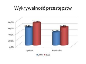 W styczniu i lutym br. w odniesieniu do zeszłego, wskaźnik wykrywalności wzrósł o prawie 15 % i osiągnął poziom 71,2 %, natomiast wykrywalność przestępstw kryminalnych wzrosła o 15,4 % i obecnie wynosi 57,1 %.