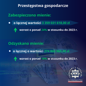 Miniony rok to czas wytężonej pracy policjantów pionu ekonomicznego. Dzięki ich zaangażowaniu w 2024 roku osiągnięto znaczące efekty w walce z przestępczością gospodarczą, korupcyjną, w tym wynikającą z ustaw szczególnych, tj. m.in.: przestępczością podatkową, bankową, na szkodę środowiska naturalnego, dotyczącą naruszeń praw własności przemysłowej oraz nielegalnego obrotu produktami leczniczymi.