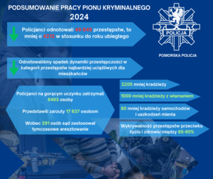 Podczas tych 12 miesięcy doszło do 49 859 przestępstw, to o 4212 przestępstw mniej niż w 2023 roku. Statystyki to nie tylko liczby, a konkretne zdarzenia, setki godzin służby policjantów pełnionej całą dobę. W minionym roku pomorscy policjanci zajmujący się walką z przestępczością narkotykową zabezpieczyli 680 kilogramów narkotyków, zlikwidowali 33 uprawy marihuany i 5 laboratoriów narkotykowych, udaremnili również cztery przemyty środków odurzających z innych krajów. Tylko w ubiegłym roku do Wydziału Poszukiwań i Identyfikacji Osób Komendy Wojewódzkiej Policji w Gdańsku trafiło 1077 zgłoszeń zaginięć. 360 zaginięć policjanci zakwalifikowali jako poziom I, czyli taki, który dotyczy bezpośredniego i realnego zagrożenia życia i zdrowia osoby. Policjanci zatrzymali 1623 osoby ukrywające się przed organami ścigania lub wymiarem sprawiedliwości, a policjanci Wydziału Wywiadu Kryminalnego KWP w Gdańsku dzięki analizie i wykorzystaniu nowoczesnych narzędzi ustalili sprawców blisko 180 przestępstw, wspierając pracę policjantów zwalczających przestępczość kryminalną, korupcyjną, gospodarczą oraz dochodzeniowo śledczą.